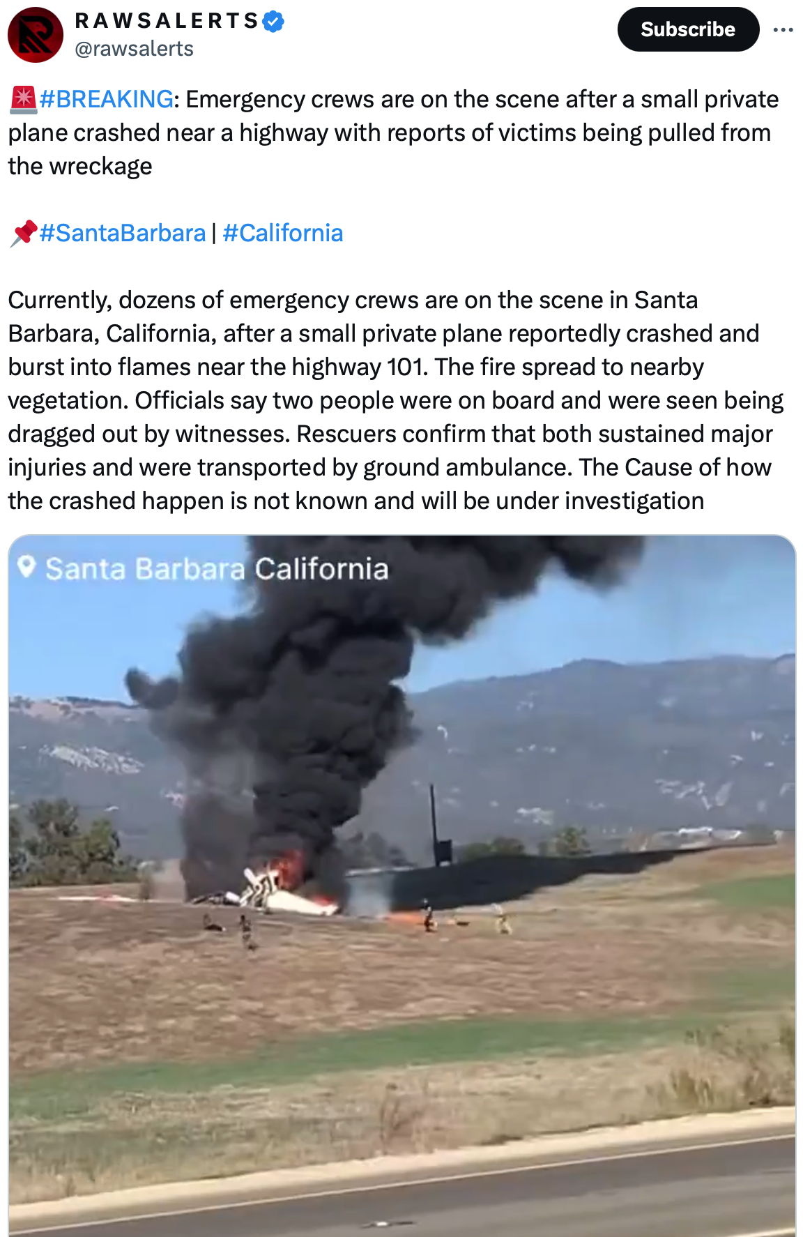 In Santa Barbara, California a small private plane “crashed and burst into flames” near Highway 101…
