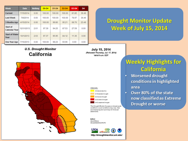 The NWS’ Drought Monitor Update for July 15 shows 81% of California in the category of extreme drought or worse, up from 78%. Three months ago, it was 68%.