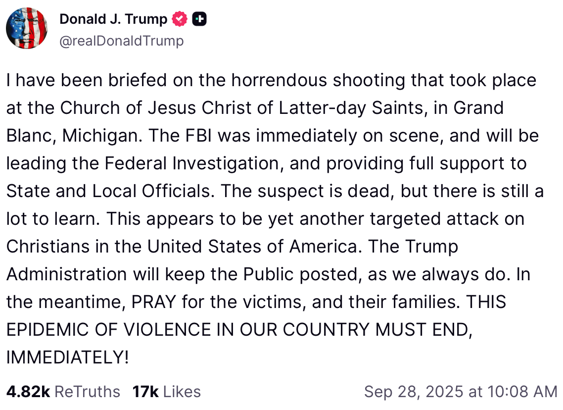 When he learned about what had happened in Michigan, President Trump declared that America’s “epidemic of violence” must end…
