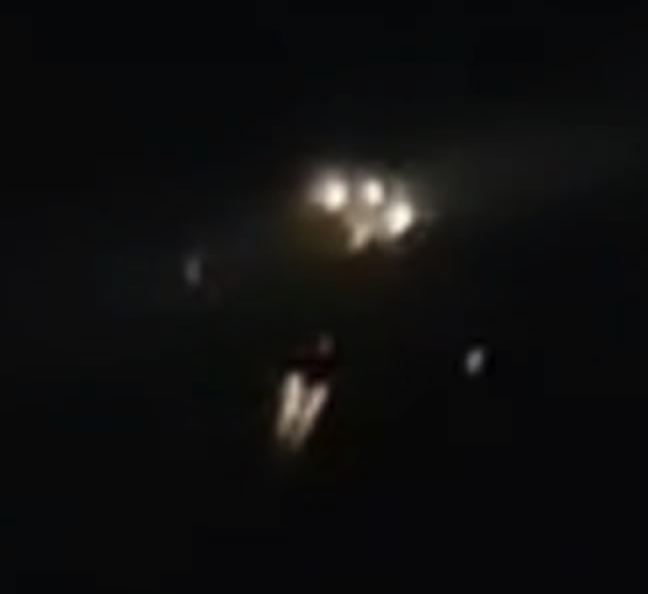 One drone, heard roaring in the skies as it moved through the darkness, appeared to have a cluster of white lights on its underbelly and red lights blinking at the tips of its wings and tail.