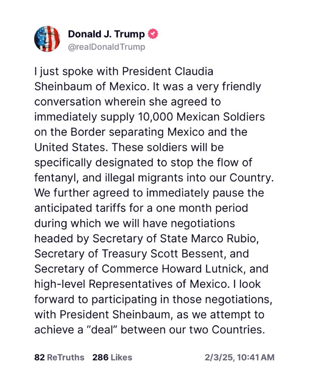 Following his conversation with Sheinbaum, the following is what Trump posted on Truth Social…