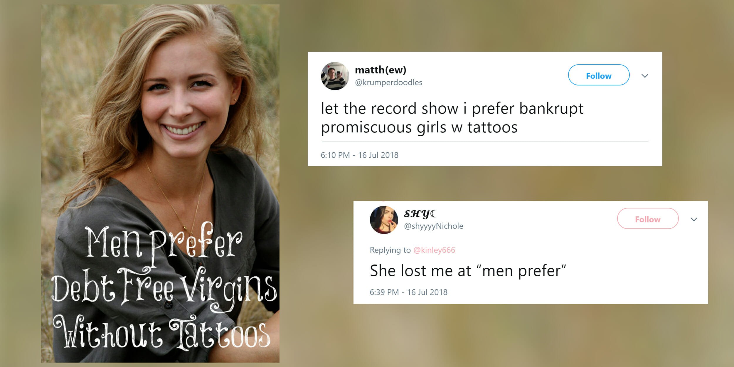 Alexander shared her throwback, patriarchial views on her website, The Transformed Wife, in a post literally titled, “Men Prefer Debt-Free Virgins Without Tattoos.” Truth is stranger than fiction, and this is not a joke.