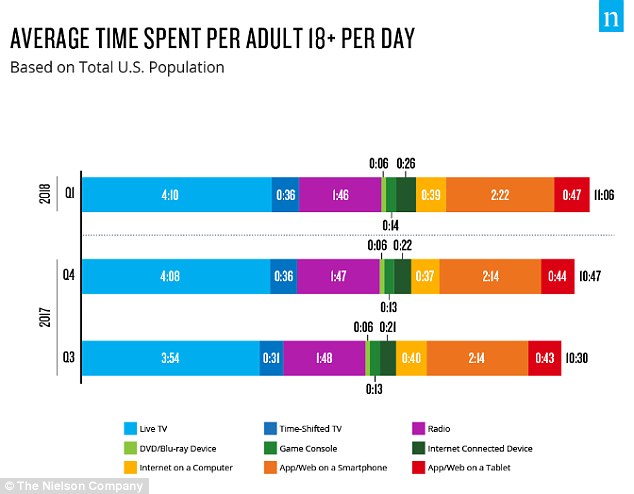 US adults are spending more than 11 hours a day on average—or about two-thirds of their waking time—consuming media in some form, Nielsen showed in its first-quarter 2018 report on US media consumption today (July 31). It measured, based on its representative panels of TV, radio, and digital households and consumers, activities like watching TV and DVDs, listening to the radio, visiting apps on a smartphone or tablet, and using the internet and game consoles.