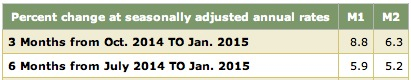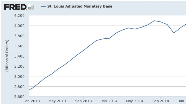 In fact, the Fed actually increased its expansion of money supply from October through the end of December. What you see above is that the annualized rate of change for the last three months of 2014 is greater than the annualized rate for the last six months of 2014. That is, in fact, a fairly sharp increase.