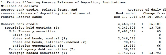 If you look at other Fed charts from October 31 (when QE supposedly ended) to the end of December, 2014, you see that the Fed continued to increase its assets through purchases credited to reserve bank accounts, which adds money into the supply. Over the course of those two months, it increased its holdings of mortgage-backed securities by $26 billion. It also dropped about $7 billion in other assets for a net increase of $20 billion to the funds in reserve bank credits.
