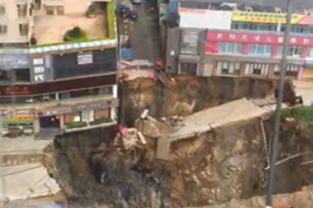 In the footage the 300 square-metre sinkhole pulls the road from under a shop and a residential tower block, leaving the buildings in a perilous position.
