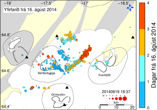 An intense earthquake swarm continues to rattle Iceland’s Bardarbunga volcano, adding to fears that a potential eruption could disrupt the region’s air traffic. Weather officials say they detected about 1,000 small quakes through Tuesday night, which were triggered by an unusually strong earthquake on Monday. The tremors are tied to the increasing movement of magma underground. “Similar to recent days, two pulses of comparably strong seismic activity have been measured between 04:00 (GMT) and 08:00 this morning, as well as 16:00 and 18:30 in the afternoon,” the Icelandic Met Office wrote on Tuesday night, according to a post published this morning. Met officials this week issued an “orange” aviation warning – the fourth-highest on a five-grade scale – following a magnitude-4.0 earthquake on Monday, the strongest in the region since 1996. The warning indicates “heightened or escalating unrest with increased potential of eruption.” The Bardarbunga last erupted in 1910, though according to the Met Office, seismic activity has been gradually increasing around the volcano over the past seven years.