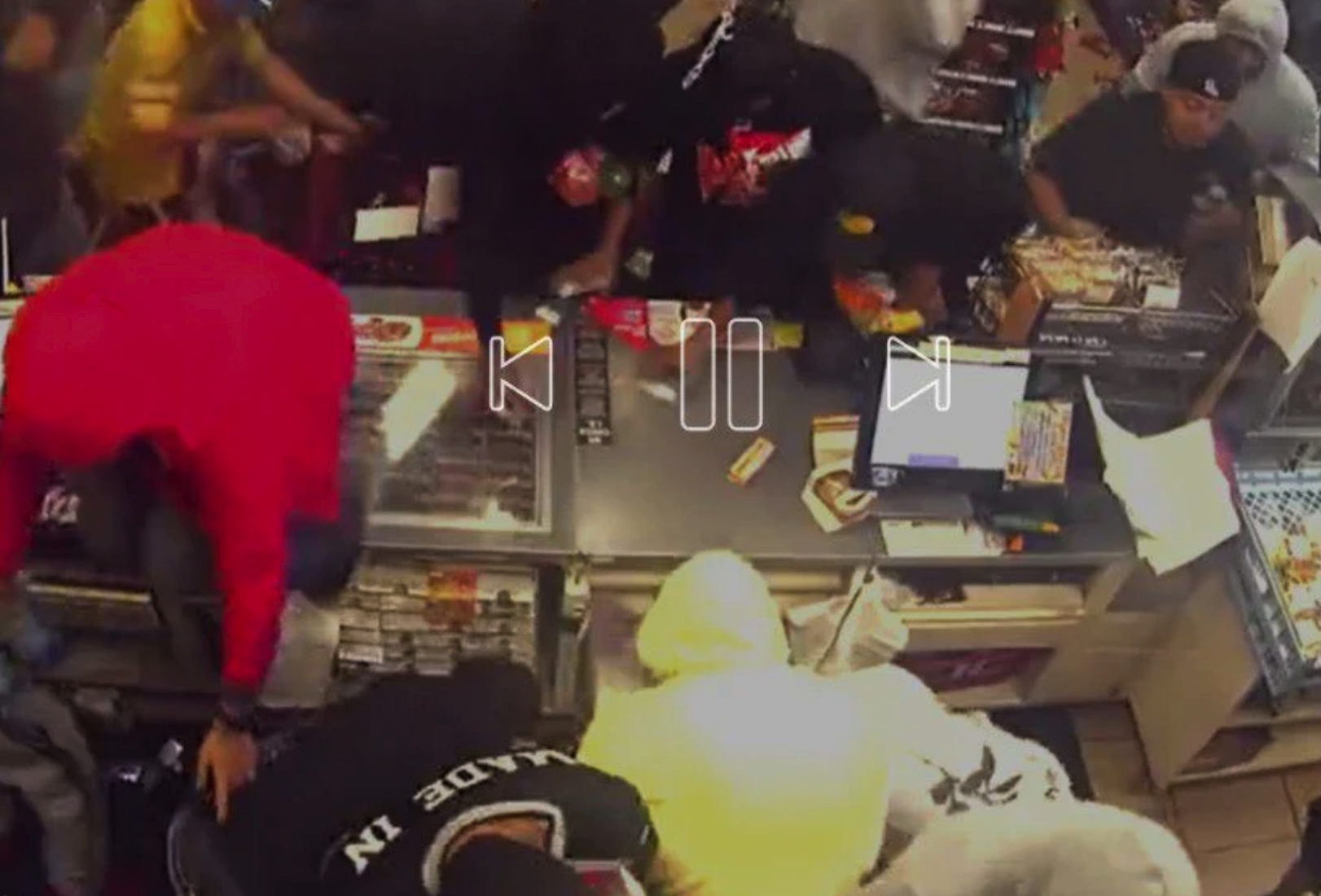 The video shows one man breaking the glass door while dozens of looters crowd behind him. Moments later, the group was seen grabbing everything from drinks, snacks, alcohol and even condoms.