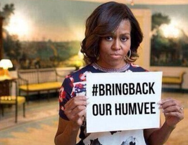 One of the most popular photos mocking the Obamas and the U.S. military under the #BringBackOurHumvee hashtag is posted below…