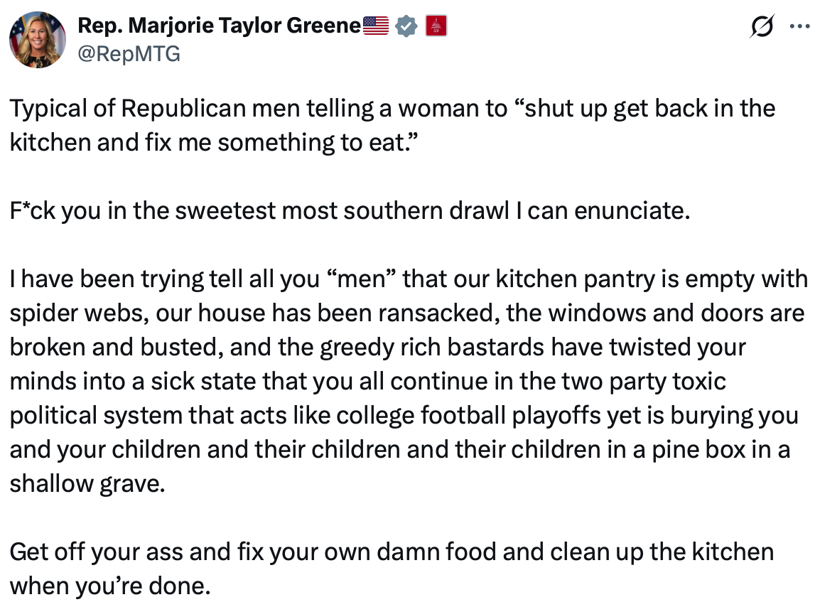 The social media posts that I am about to share with you contain some raw language, but I think that it is critical that we attempt to understand what Marjorie Taylor Greene is trying to tell us.