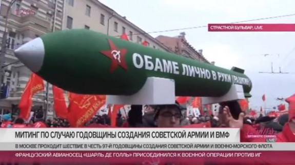 During one recent military parade, a large missile was paraded through the streets with a message to Barack Obama written on the side. Roughly translated, the message says “to be personally delivered to Obama”…