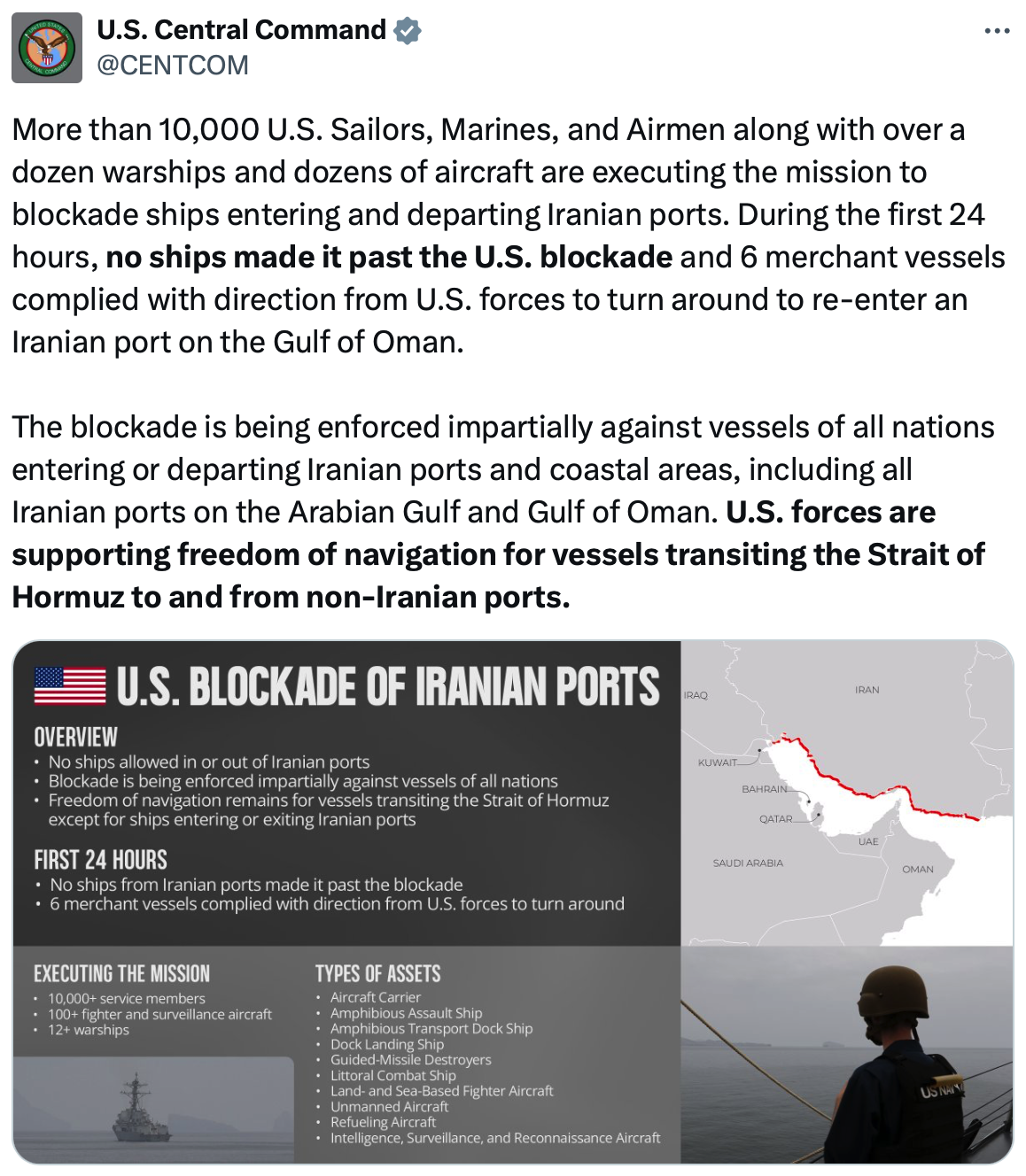 According to U.S. Central Command, during the first 24 hours “no ships made it past the U.S. blockade”…
