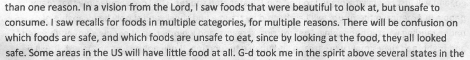 Sonja was also shown that there would be widespread recalls of foods and that there would be confusion on what foods are safe to eat…
