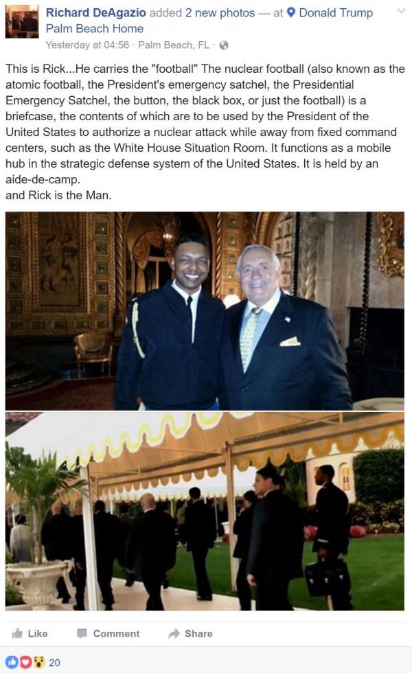 Richard DeAgazio, a 72-year-old Palm Beach businessman, Trump supporter and actor, raised some eyebrows over the weekend after he essentially live blogged Trump’s Mar-A-Lago golf outing with Japanese Prime Minister Shinzo Abe. Among other misguided posts, DeAgazio thought it would be a really good idea to pose with, and publicly identify, “Rick”, the service man responsible for carrying the “nuclear football.”