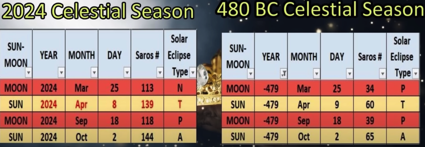 According to the Supernatural By Design YouTube Channel, the dates that eclipses occur in 2024 align almost perfectly with the dates that eclipses occurred in 480 BC…