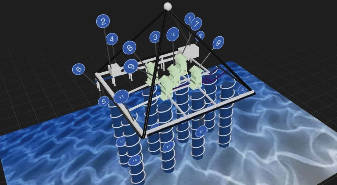 Below these 5 structures are 8 cylindrical structures which appear to be vertical wells, hollow inside, and surrounded by descending spiral pathways. These 8 vertically aligned cylindrical structures, arranged in two parallel rows from north to south, descend to a depth of 648 meters where they all merge into two large cubic structures measuring approximately 80 meters per side.
