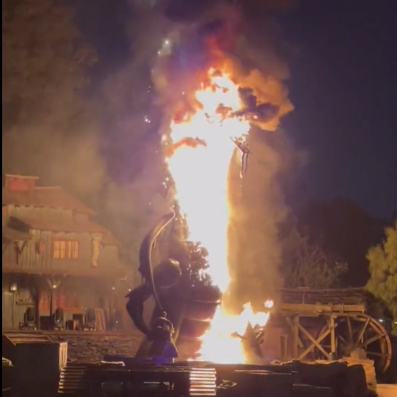 Citizen video captured by parkgoers shows massive flames fully engulfing Maleficent’s dragon prop on stage. The flames first ignited from the dragon’s face before spreading to the rest of its body.