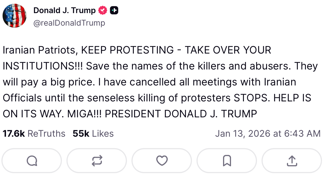 Has there ever been a social media post more important than the one that President Trump just made? I believe that it would be very difficult to overstate the significance of what we have just witnessed. Now that Trump has decided to publicly back the revolution in Iran, it is either regime change or bust. And by publicly declaring that the U.S. is going to help the protesters, he has made it very clear that there will be a military showdown with the Iranians. War is here, and we are going to witness a staggering amount of death and destruction.