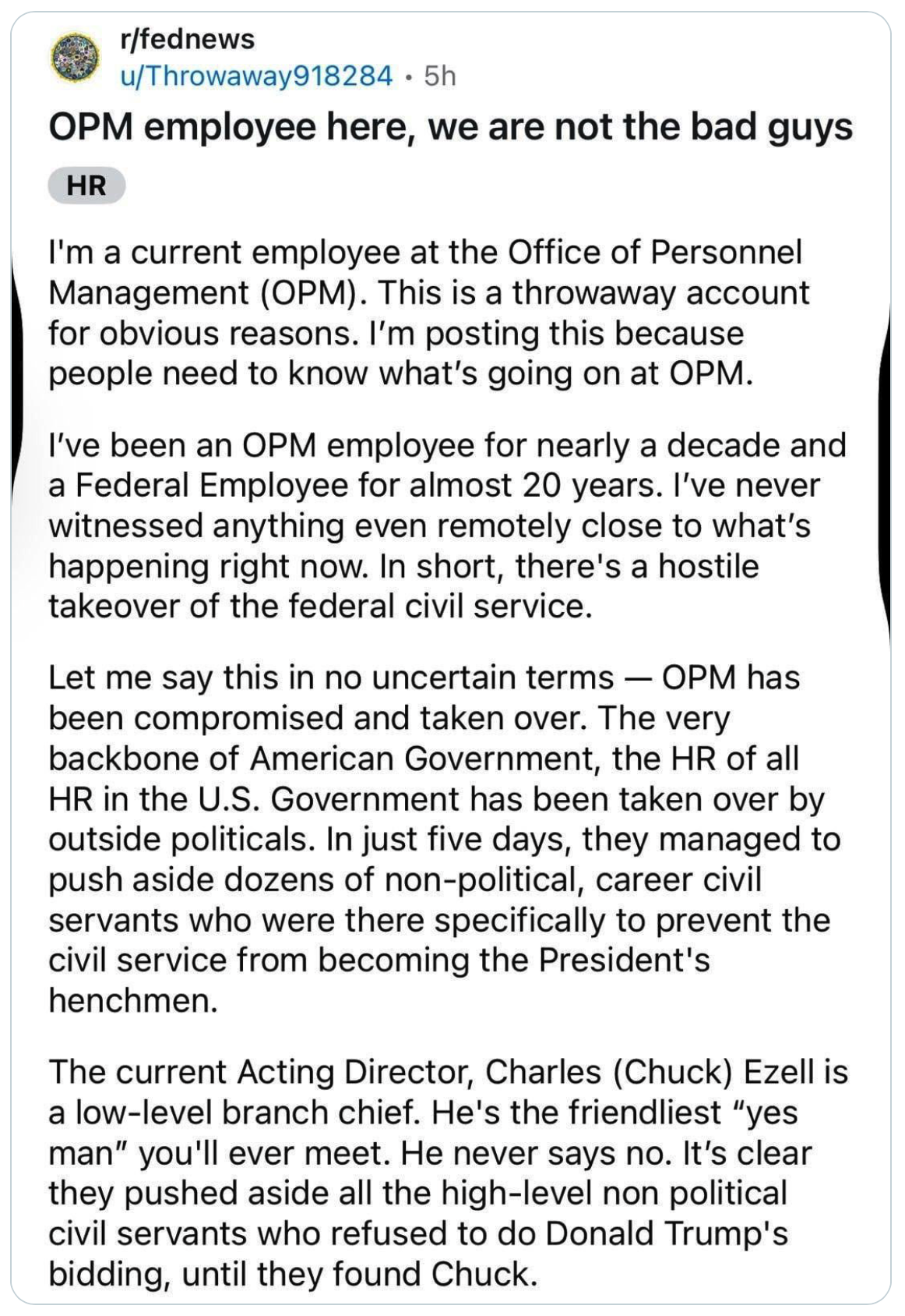 Let me give you an example of what I am talking about. A “current employee at the Office of Personnel Management” says that Trump has initiated a “hostile takeover of the federal civil service”. This is the message that this anonymous employee posted on Twitter…