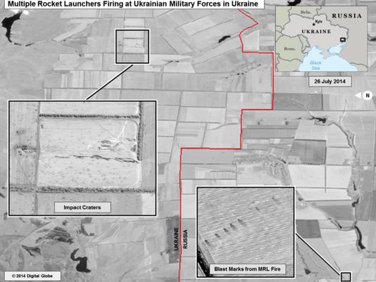 The United States released a series of satellite images Sunday that appear to support its claims that Russian forces have fired across the border into Ukraine to support rebels there, suggesting a new level of direct Russian involvement in the conflict.