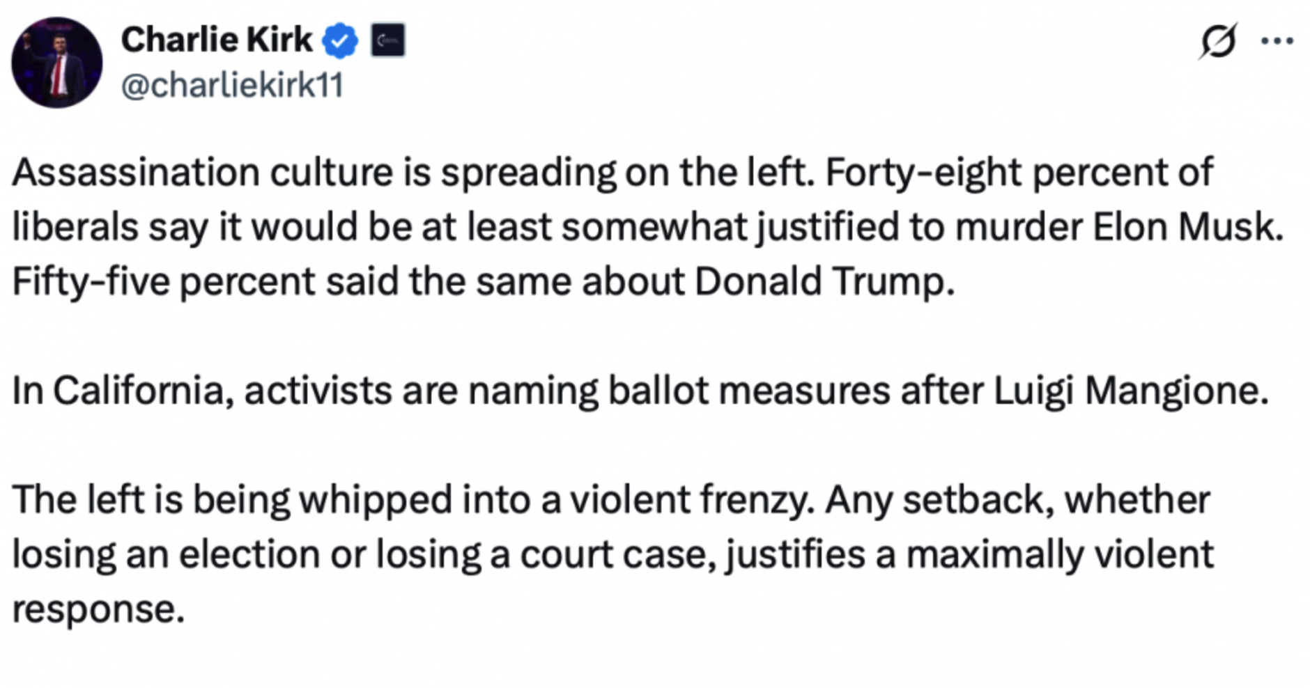 On April 7th of this year, Charlie Kirk drove this point home in a tweet in which he warned that “assassination culture is spreading on the left”…