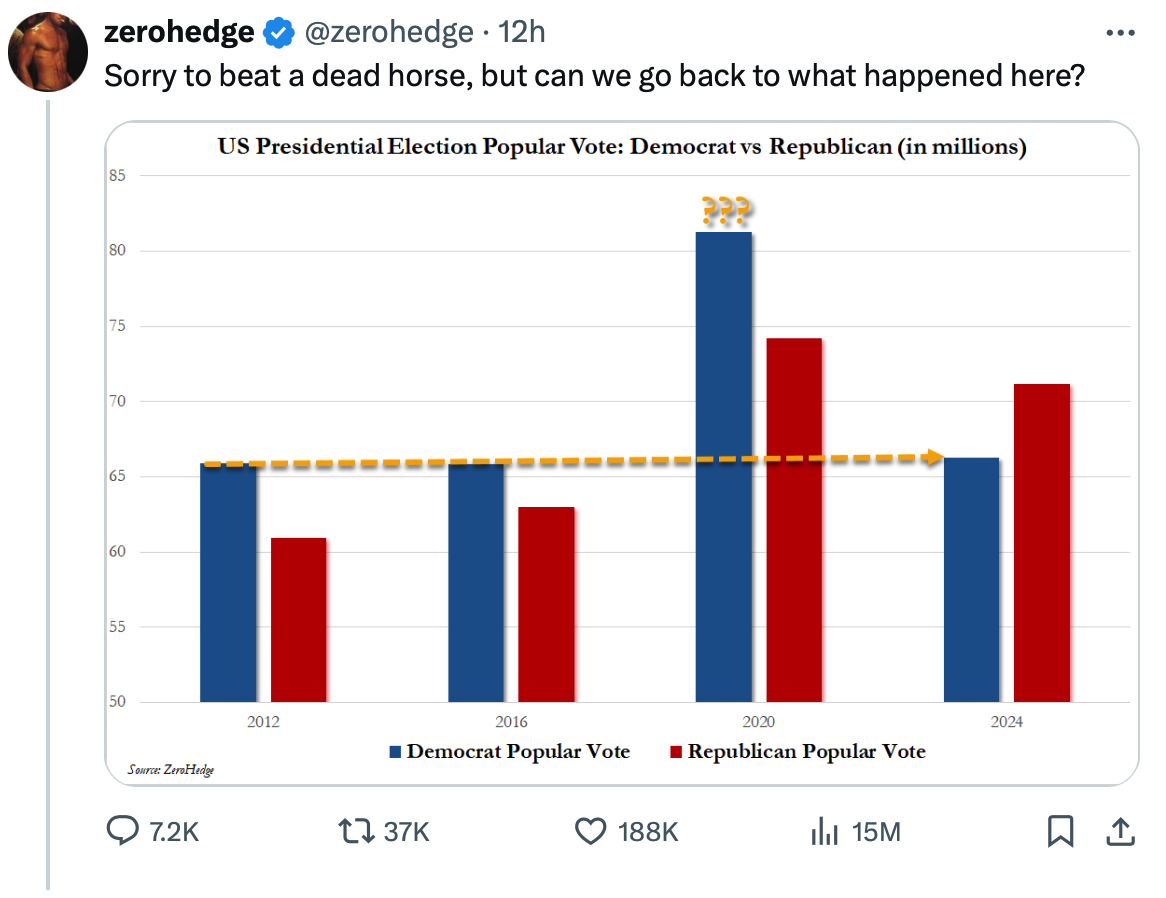 Interestingly, Kamala Harris got about the same number of votes that Democratic candidates did in 2012 and 2016. As Zero Hedge has noted, this is raising fresh questions about how the Democrats were able to do so well in 2020…