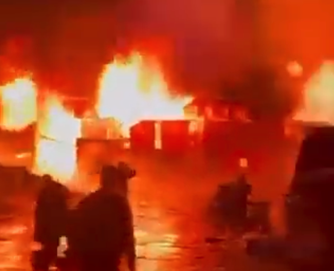 Footage close to the scene shows huge flames engulfing the facility and plumes of black smoke rising from the area, while emergency vehicles and fire trucks could be seen outside the complex.