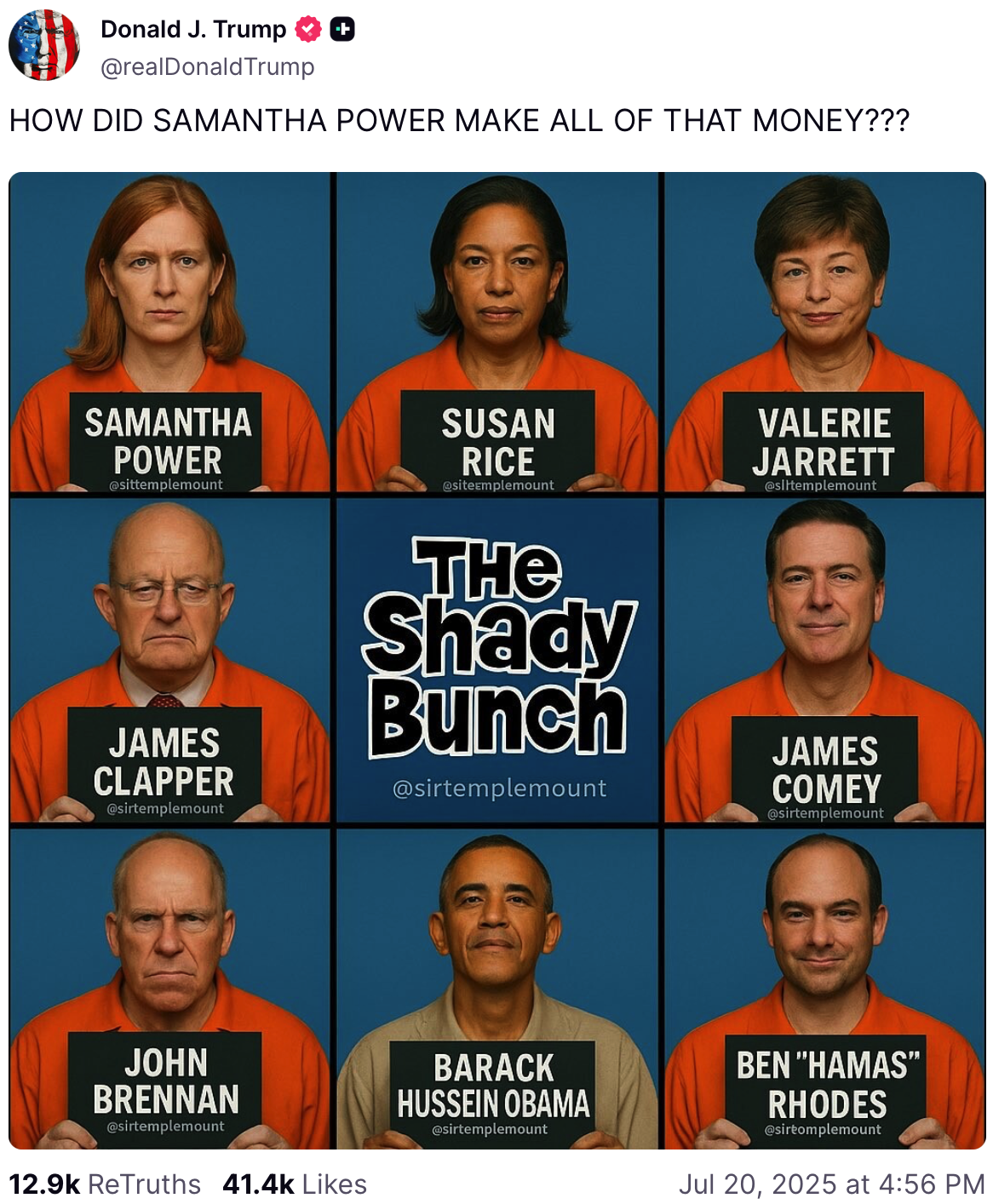 After sharing the AI video, Trump also posted a meme that shows Obama and key members of his team posing for mugshots.