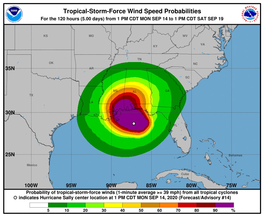 Sally’s outer bands should begin to reach the Gulf Coast Monday morning with significant progress inland not expected until Wednesday morning.