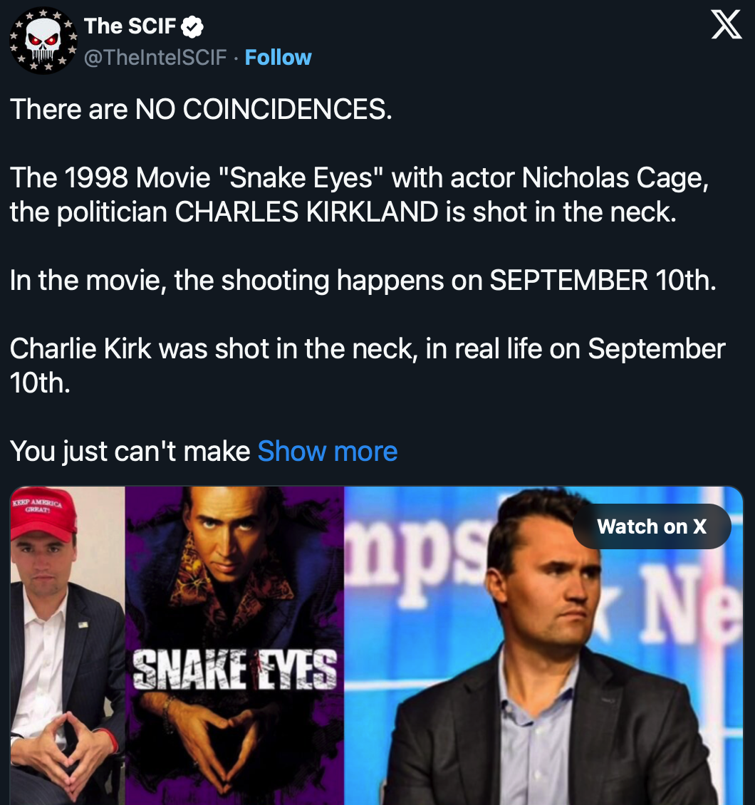 #8 The name of the film is “Snake Eyes”. Interestingly, Charlie Kirk was assassinated during “the Year of the Snake”…
