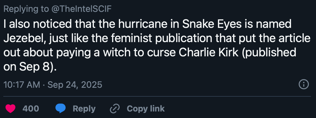 #9 “Jezebel” is the name of the hurricane in the film. One Internet sleuth has correctly pointed out that Jezebel is also the name of the feminist publication that hired witches to put a curse on Charlie Kirk shortly before he was assassinated…