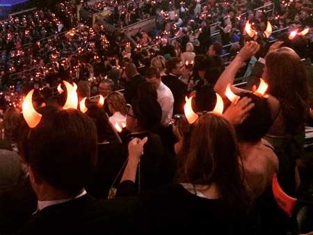 They launched with their new song, “Rock or Bust,” and then went into their satanic anthem, “Highway to Hell.” As they began to play the song, the audience was cued to take a gift that was supplied to them by the Grammys and place it on their heads.