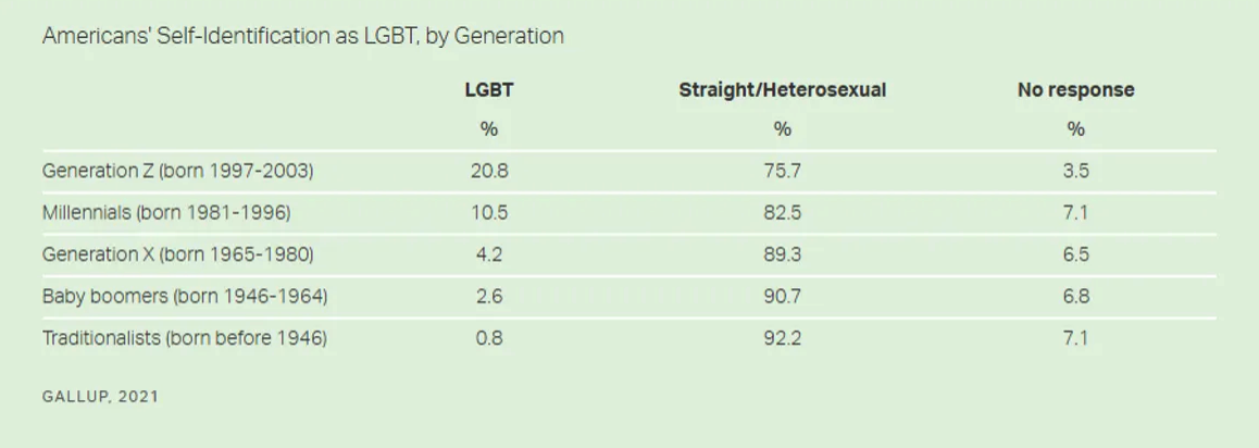 According to a Gallup survey that was conducted last year, Americans that belong to Generation Z are more than 20 times as likely to identify as LGBT as Americans that were born before 1946 are.