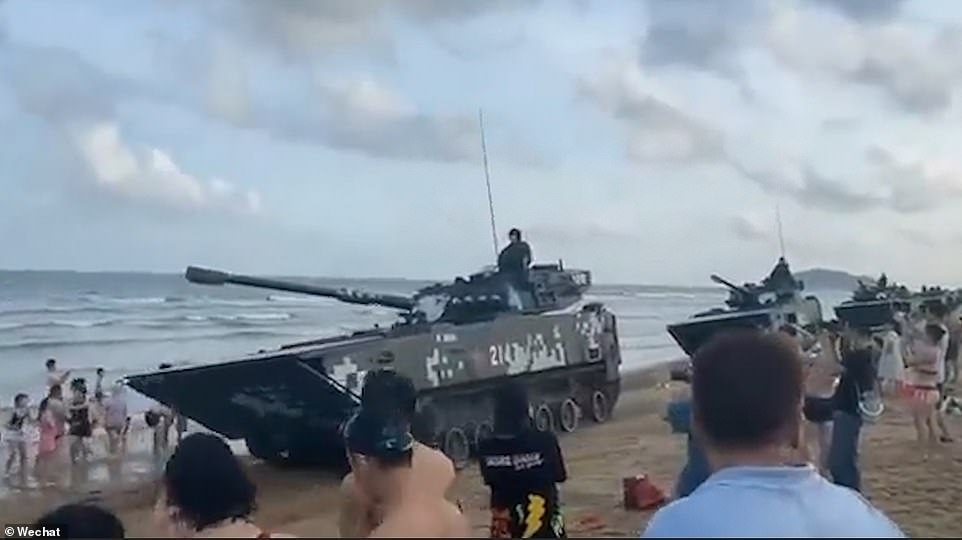 And chilling footage shared on Chinese social network Weibo appears to show a column of amphibious tanks reportedly massing on beaches in Fujian along the Taiwan Strait.