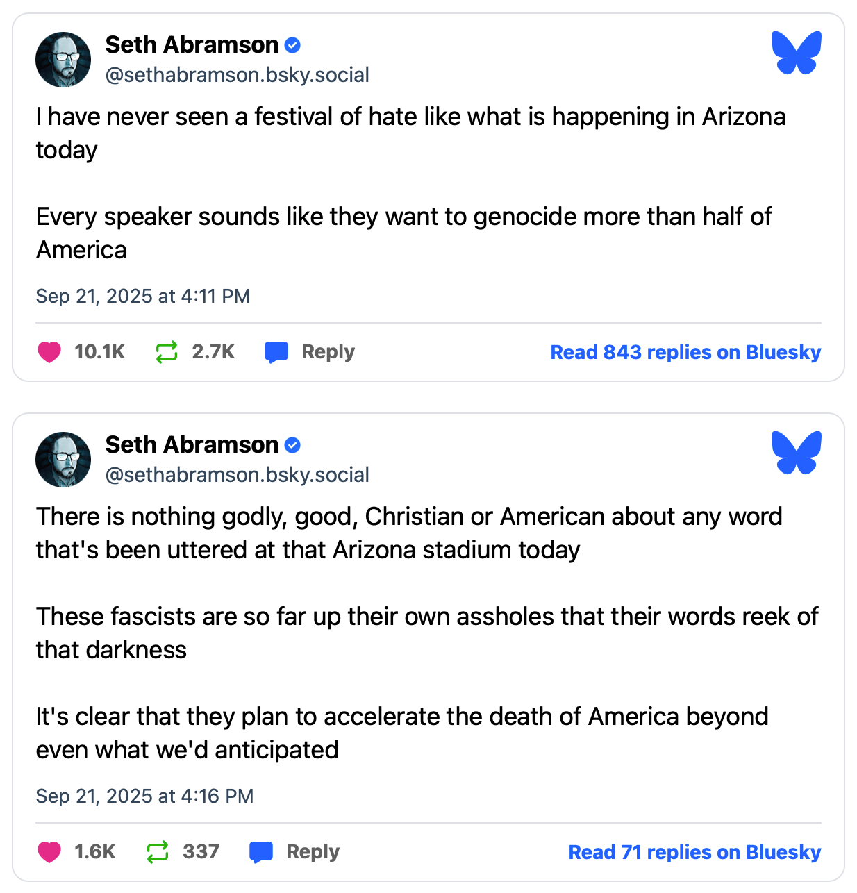 Let me give you an example of what I am talking about. The following are a couple of posts that far left journalist Seth Abramson made on his BlueSky account during Charlie Kirk’s memorial service on Sunday…