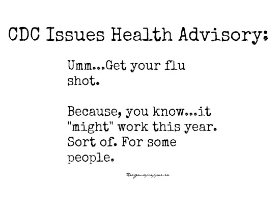 The Center for Disease Control (and Big Pharma Pimp Extraordinaire) released an advisory yesterday letting us know that the vaccine is not really a very good match to the flu circulating this year. (The emphasis below is mine).