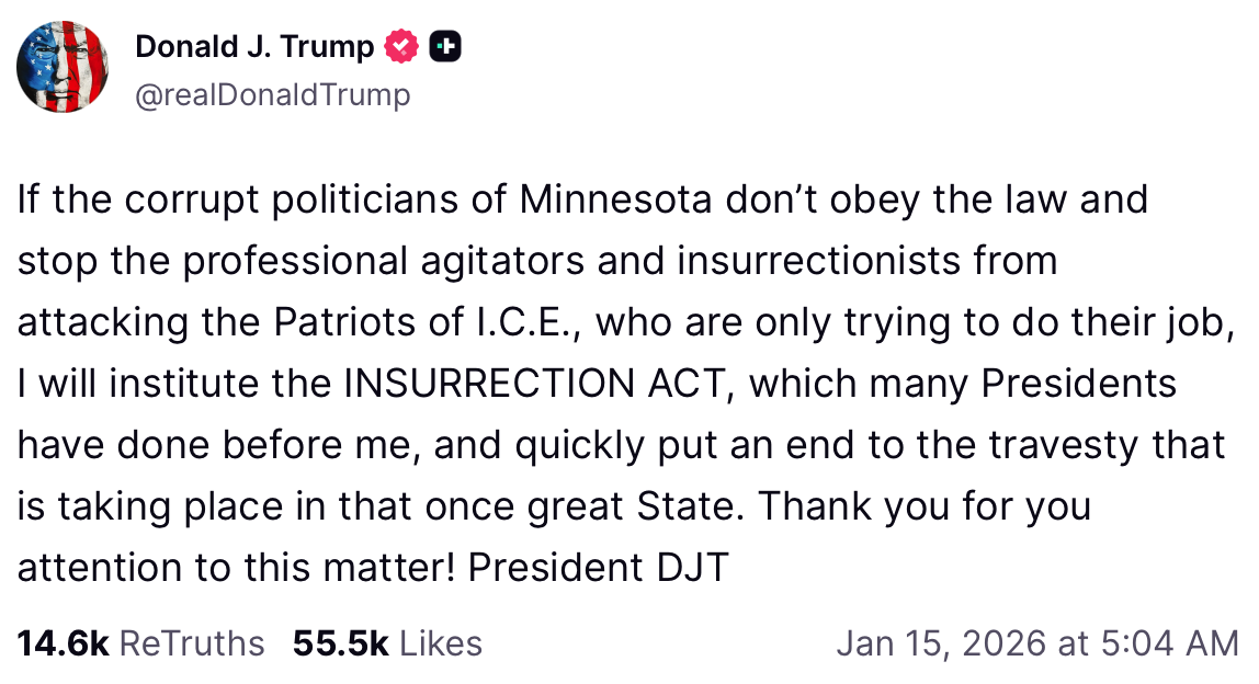 A state of lawlessness exists on the streets of Minneapolis at this moment, and President Trump just threatened to invoke the Insurrection Act…