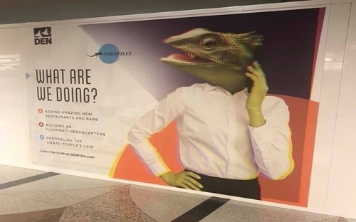 If Denver International Airport wanted to get people to stop talking about the incredibly strange theories that have been circulating about the airport, this isn’t the way to do it. In construction zones inside DIA, enormous posters have been put up that supposedly mock the bizarre “conspiracy theories” that have been circulating ever since the airport first opened more than 20 years ago. In addition to asking if the airport is “preparing for the end of the world”, these new posters prominently feature Illuminati symbols, underground tunnels and lizard people. Why in the world would they do something like this?