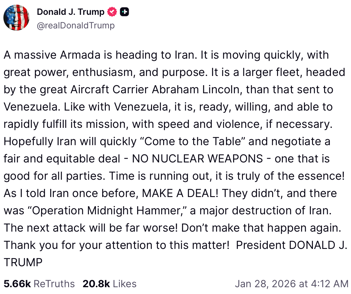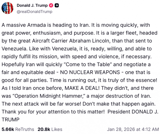 On Wednesday, Trump specifically mentioned the Abraham Lincoln in a Truth Social post that was directed squarely at Iran…