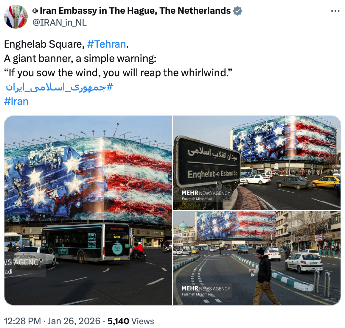 A slogan – warning the US to not attempt a military strike on the country – is emblazoned across one corner: ‘If you sow the wind, you will reap the whirlwind.’