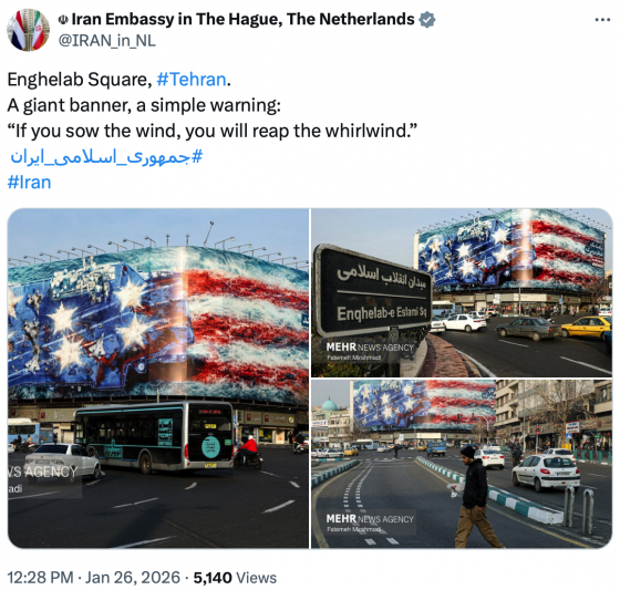 The Iranian regime unveiled a new mural on a giant billboard in Tehran’s Enghelab Square on Sunday, depicting an aircraft carrier with damaged and exploding fighter planes on its flight deck.