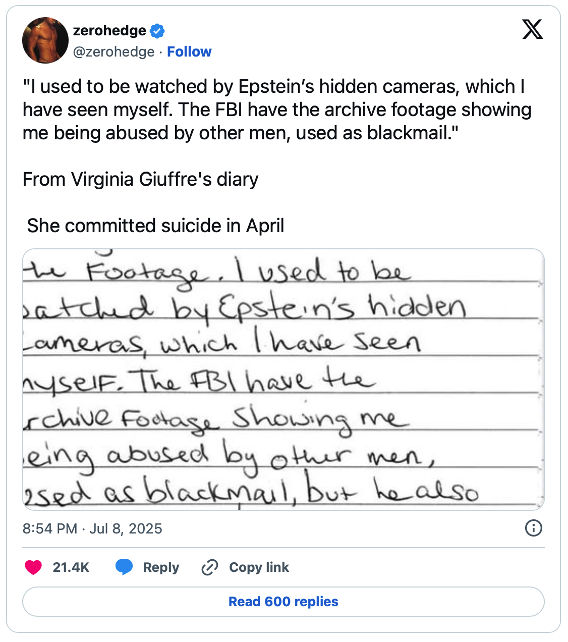 But in Virginia Giuffre’s diary, it clearly states that she was “watched by Epstein’s hidden cameras” and that there is “archive footage showing me being abused by other men, used as blackmail”…