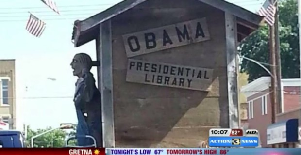 The float, which featured in last week’s July 4th annual Independence Day parade in Norfolk, Nebraska, depicted a zombie stood outside a hut adorned with the words “Obama Presidential Library.”
