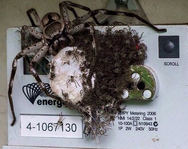 A huge spider and hundreds of its babies have been found nestled on an electricity meter in Queensland.