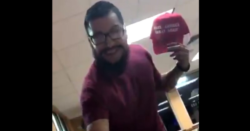 A man was fired after he was caught on camera stealing a MAGA hat and throwing a drink in a teen’s face.