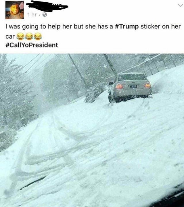 Man Refuses To Help A Woman That Slid Off The Road During A Snowstorm Because Her Car Had A Trump Sticker December 19, 2018 This photo is presented without any additional comment…