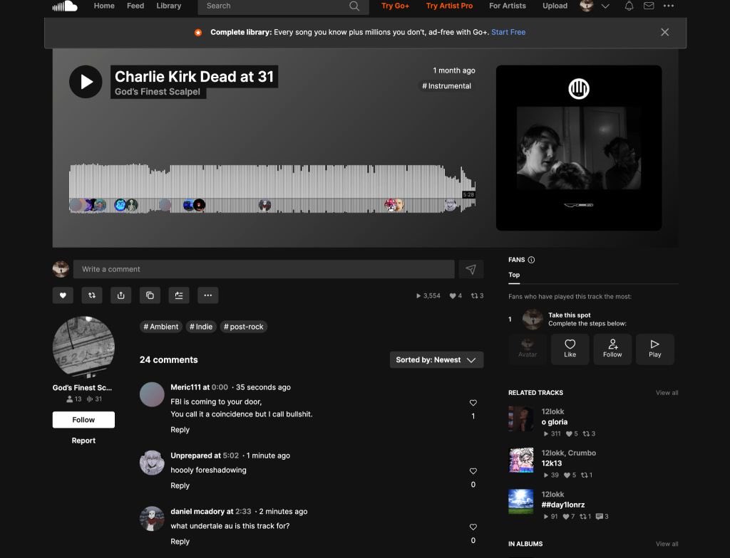 Lastly, the Gateway Pundit has pointed out that a month before the assassination someone posted two SoundCloud tracks that clearly indicate foreknowledge of an attempt on Charlie Kirk’s life…