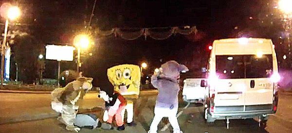 As the Moscow Times reported, “The victim must have thought he was dreaming as Spongebob Squarepants, Mickey Mouse, a squirrel that looks like Scrat from ‘Ice Age,’ and an unidentified rabbit, kicked and punched him as he lay defenselessly on the floor.”