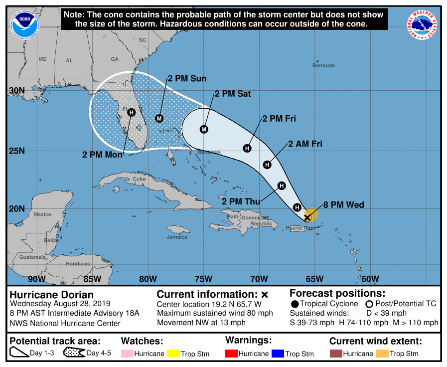 That’s the latest word from the National Hurricane Center, whose 5 p.m. ET forecast calls for Dorian to pick up steam over the Atlantic’s warm water and head toward the U.S. coast as a Category 3 hurricane with winds of at least 111 mph. It’s now a Category 1, with sustained winds of 80 mph, but the NHC predicts “marked intensification” in the next 72 hours.