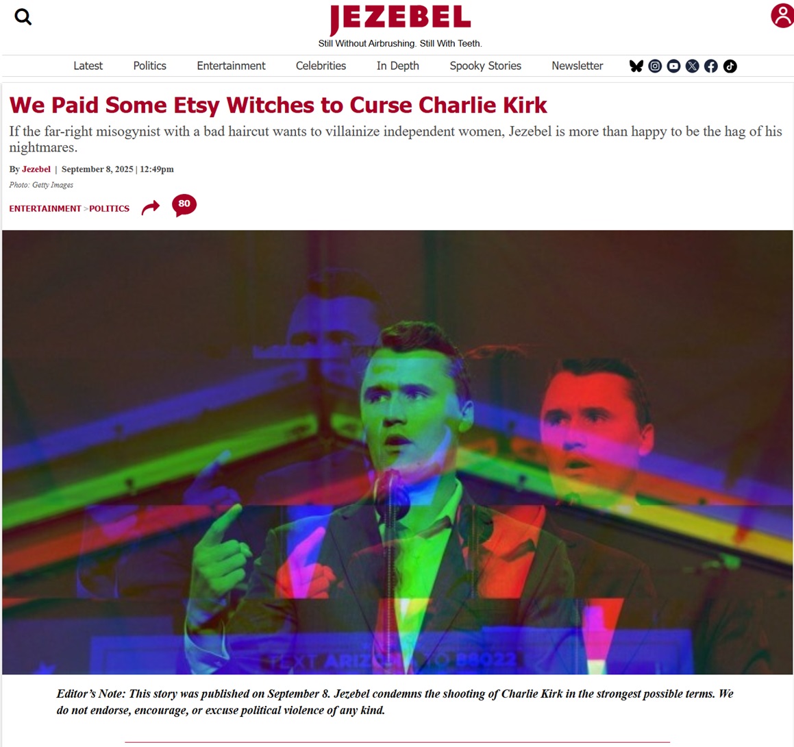 The website Jezebel has released a statement after paying witches to put a curse on conservative activist Charlie Kirk – just two days before he was shot and killed Wednesday at a Utah college event.